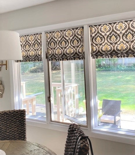 Faux Roman Shade Valance in Dark Taupe and Gold Damask Print, Fully Lined, Custom Made