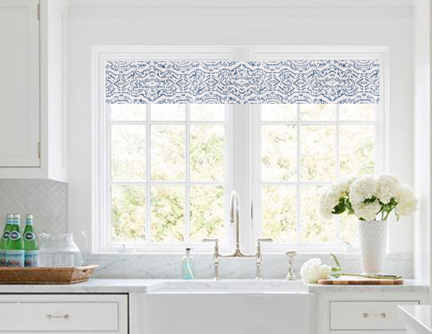 Straight Modern Valance in Jazmin Space Blue Print on Premium Cotton Linen, Custom Made, Fully Lined, Custom Made, Modern Native Jazmin Print